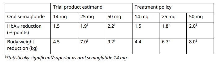此次公布的IIIb期研究持续68周,旨在评估50mg或/和25mg的口服司美格鲁肽(每日1次)对比目前最大批准剂量(14mg,每日1次),在治疗既往接受过其它口服降糖药治疗的2型糖尿病成人患者的有效性和安全性。主要终点为患者在第52周和第68周的糖化血红蛋白水平(HbA1c)变化。