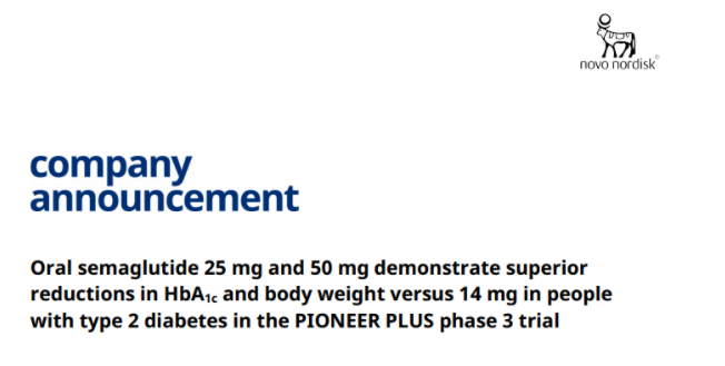 近日,诺和诺德公布了口服司美格鲁肽Rybelsus(25mg和50mg)治疗2型糖尿病成人患者的IIIb期PIONEER PLUS研究的关键积极结果,数据显示血糖降低和体重减轻。诺和诺德执行副总裁 Martin Holst Lange 表示,这进一步证明了口服司美格鲁肽对2型糖尿病患者的益处,如果需要额外的血糖控制或减肥,25mg和50mg剂量是更高疗效的选择。