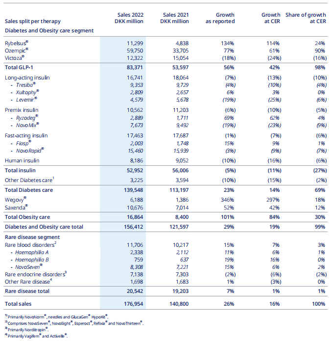 2022年,司美格鲁肽皮下注射制剂Ozempic累计销售额达597.50亿丹麦克朗,口服片剂Rybelsus销售额达112.99亿丹麦克朗,减重产品Wegovy销售额则达61.88亿丹麦克朗。总体,司美格鲁肽系列产品为诺和诺德贡献合计772.37亿丹麦克朗(约合108.82亿美元)的销售收入。