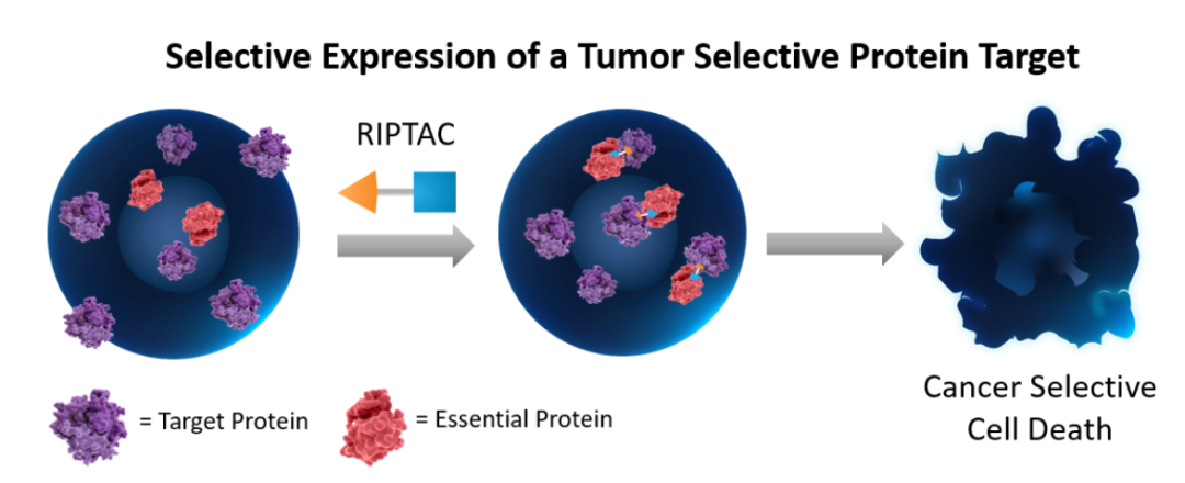 AACR大会也是新锐公司展现前沿技术的舞台。今年的AACR大会上,由蛋白降解先驱,耶鲁大学教授Craig Crews教授联合创建的Halda Therapeutics公司公布了其调节诱导接近靶向嵌合体(RIPTAC)的临床前实验结果。RIPTAC的一端可以与肿瘤细胞中高度表达的蛋白相结合,而另一端与细胞内和细胞生存紧密相关的蛋白结合。它们构成的三元复合体会抑制维持细胞生存蛋白的功能,从而导致肿瘤细胞的死亡。而健康细胞因为蛋白表达水平不高,不会被RIPTAC分子杀死。