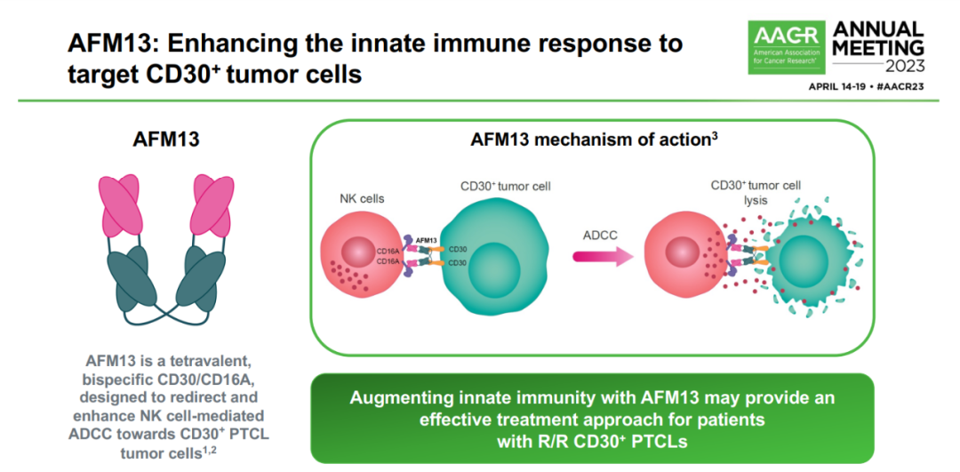 Affimed公司公布了其先天细胞衔接蛋白(innate cell engager,ICE)AFM13治疗复发/难治性外周 T 细胞淋巴瘤(PTCL)的2期临床试验结果。AFM13是一种4价双特异性蛋白,可以将自然杀伤(NK)细胞募集到CD30阳性PTCL周围,并且增强NK细胞介导的抗体依赖性细胞毒性。