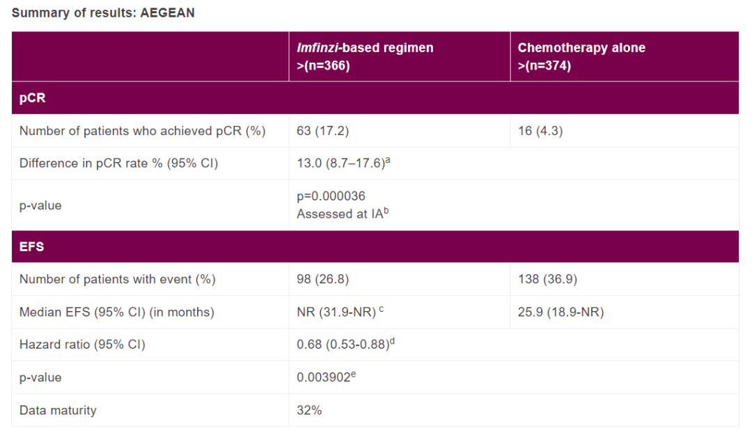 此外,对病理学完全缓解(pCR)的最终分析显示,手术前使用Imfinzi加新辅助化疗的pCR率为17.2%,仅接受新辅助化疗的患者这一数值为4.3%。