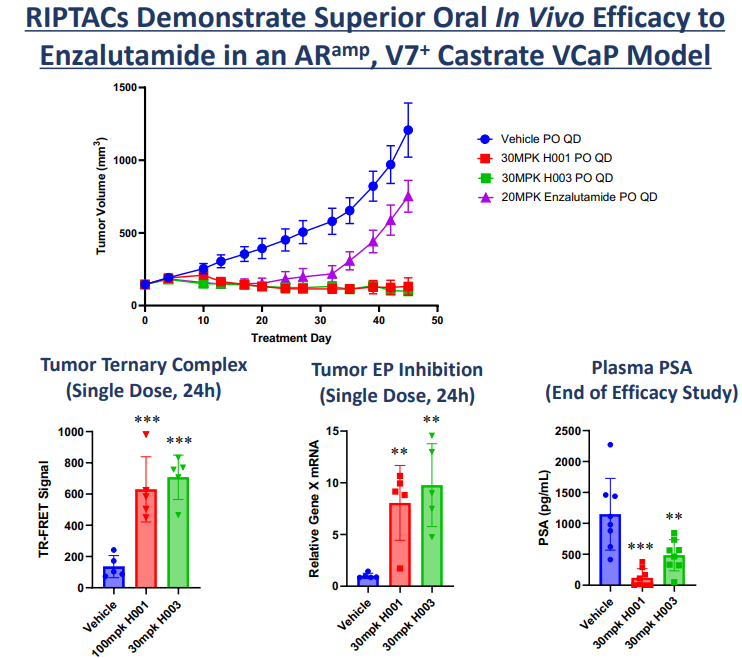 在AACR大会上公布的数据显示,靶向雄激素受体(AR)的多种在研RIPTAC分子在对恩杂鲁胺耐药的前列腺癌小鼠模型中,与恩杂鲁胺相比,显示出更好的口服抗癌活性。