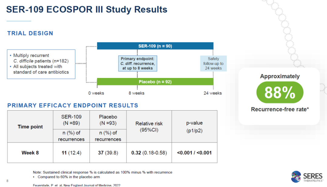Seres公司的坚持在2020年终于收获回报,在关键性3期临床试验ECOSPOR III中,SER-109达到试验的主要终点,接受治疗8周后,SER-109组患者的复发率为12.4%,而安慰剂患者为39.8%。与安慰剂组相比,SER-109治疗组的疾病复发相对风险为0.32(95% CI,0.18,0.58)。这项临床试验的结果在著名医学期刊《新英格兰医学杂志》和《美国医学会杂志》上发表。去年10月,SER-109的生物制品许可申请获得美国FDA授予的优先审评资格。
