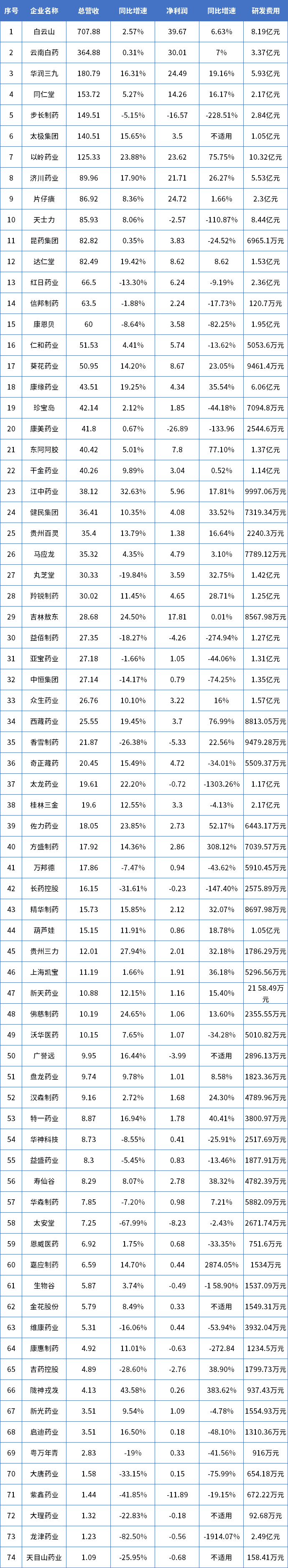表1 2022年中药上市公司业绩统计分析(单位:亿元)