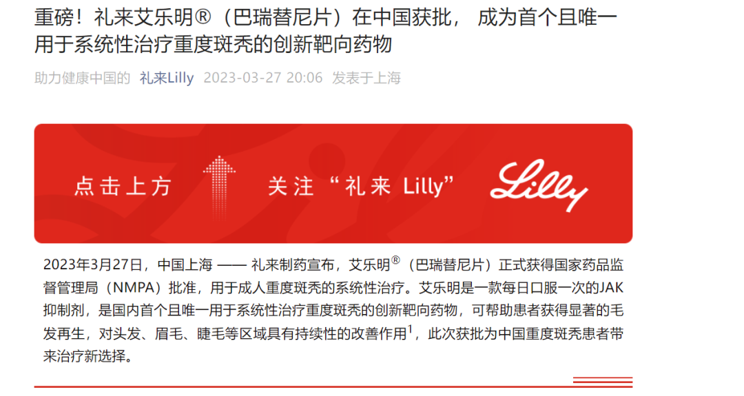 3月27日,礼来制药宣布,艾乐明(巴瑞替尼片)正式获得药监局批准,用于成人重度斑秃的系统性治疗。值得一提的是,艾乐明也是国内首个且唯一用于系统性治疗重度斑秃的创新靶向药物。