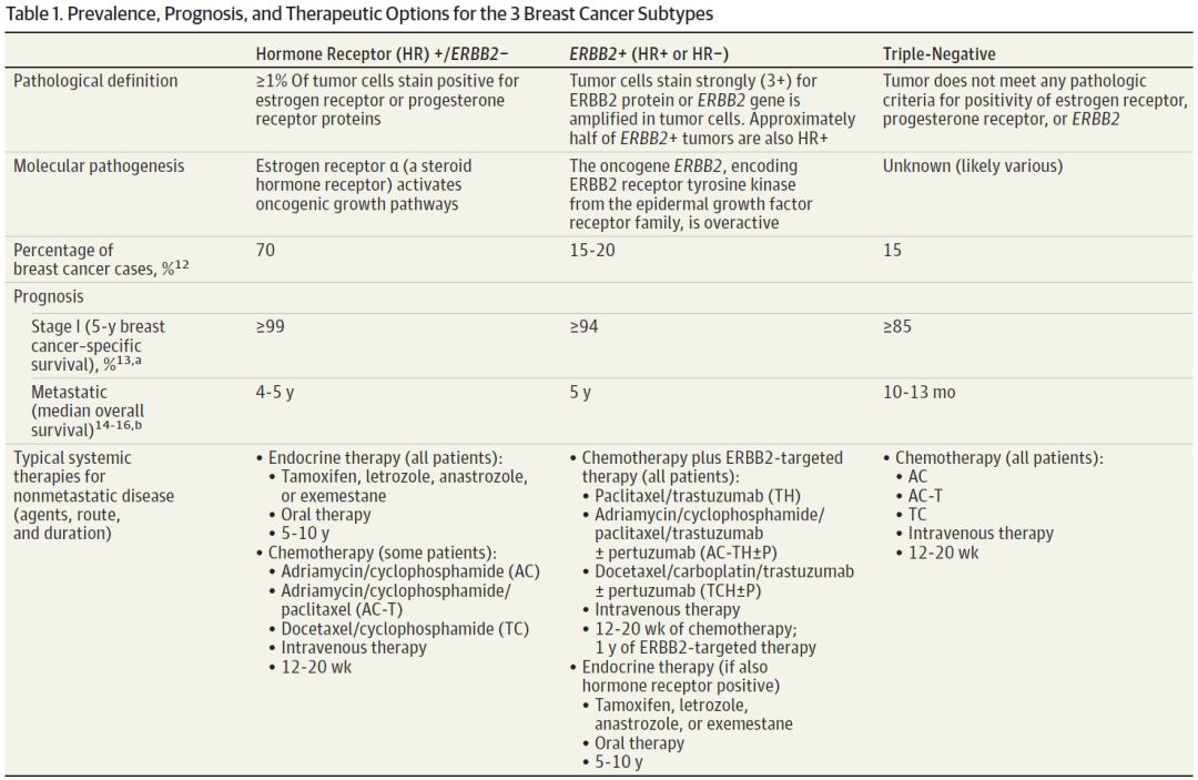 乳腺癌可以分为三个主要的亚型,即HR+/HER2-乳腺癌(占所有乳腺癌的70%)、HER2+乳腺癌(占所有乳腺癌的15-20%)、三阴乳腺癌(占所有乳腺癌的15%)。
