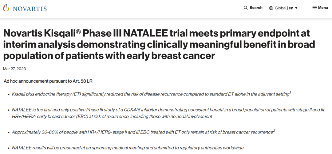 2023年3月27日,诺华宣布CDK4/6抑制剂Kisqali辅助治疗HR+/HER2-早期乳腺癌患者的三期临床NATALEE在中期分析中达到主要终点iDFS,独立数据监察委员会建议提前终止试验。
